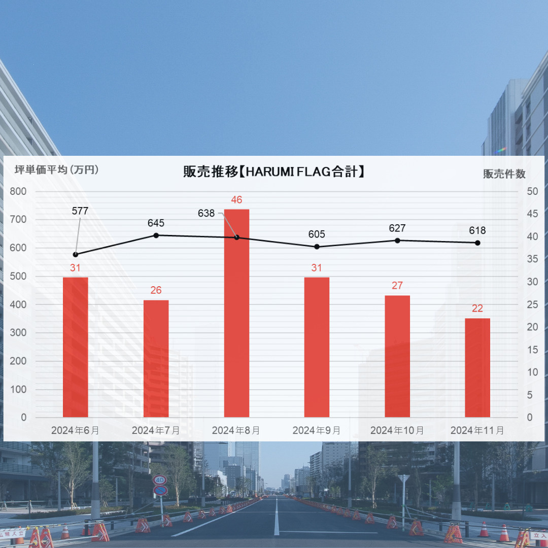 先月はHARUMI FLAG全体で合計22件の住戸が販売を開始しており、前月比では81%の件数でした。販売時の坪単価は618万円と前月比微減となります。