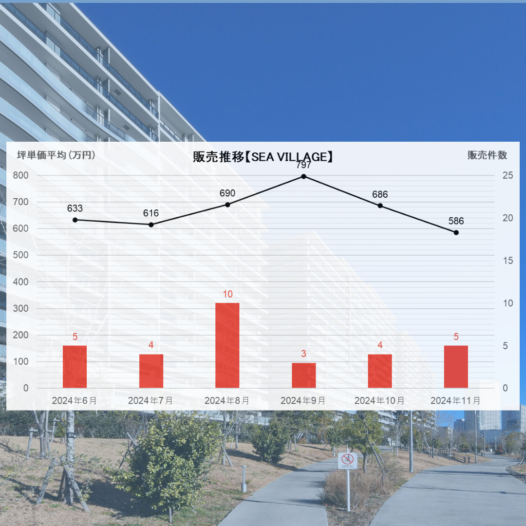 各街区別の状況では、Sea Villageは販売件数自体は顕著に推移しているものの、坪単価600万円台(販売価格15,600万円~17,500万円)の販売住戸が増えております。尚、Sea Village B棟の5階住戸(113.01㎡ / 3LDK)が16,000万円(坪単価468万円)で販売を開始し、希少性のある100㎡以上の住戸であり、価格も過去の成約事例と比較してもリーズナブルになりますので、お勧めできる住戸となります。