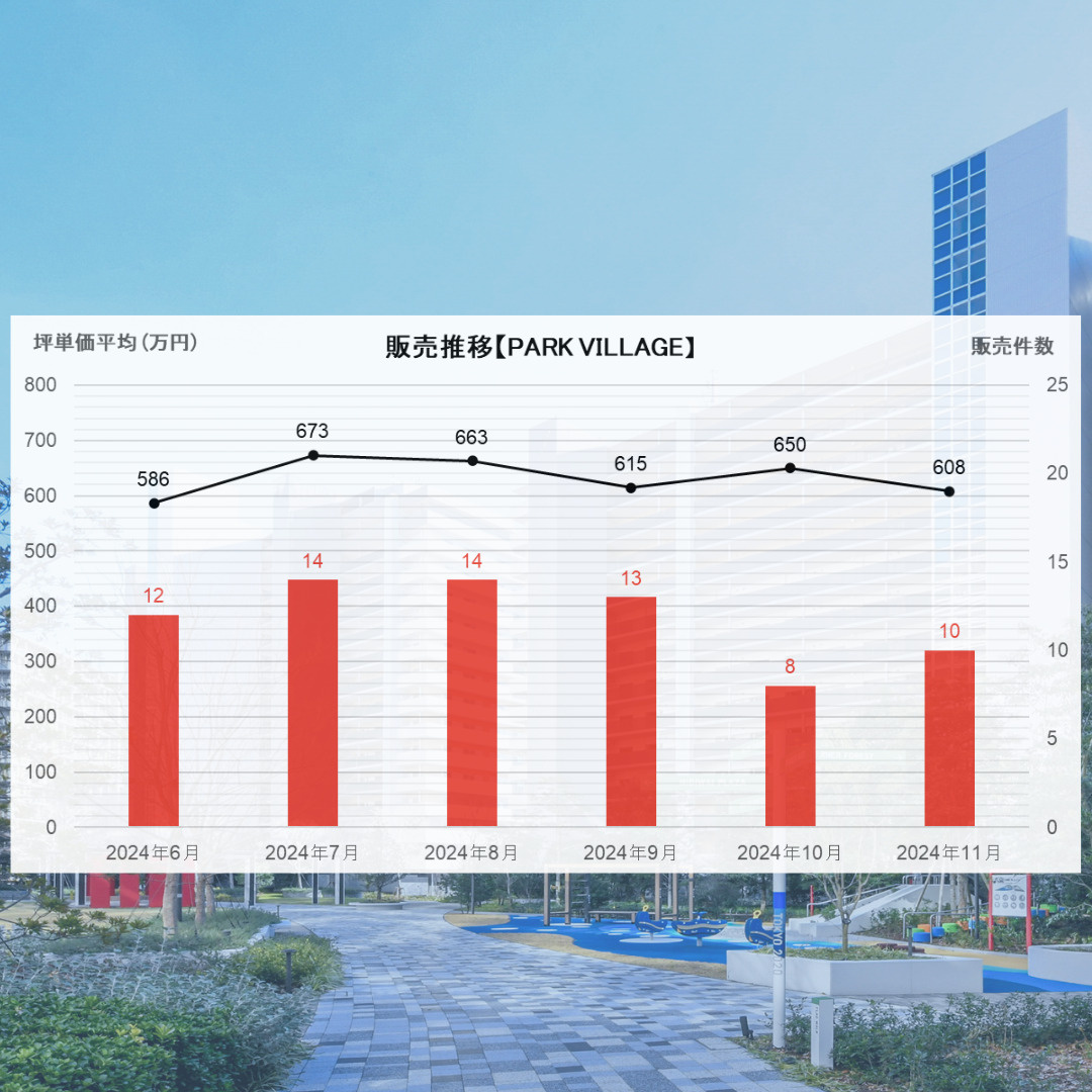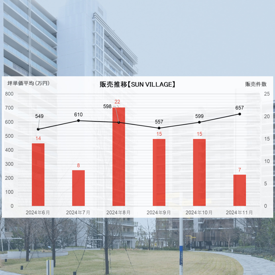 Sun Villageは販売件数自体は7件と前月比と比較すると下落していますが、A棟やB棟等の眺望が開けた住戸の販売が多く、平均坪単価は657万円と、過去最高単価で推移しております。