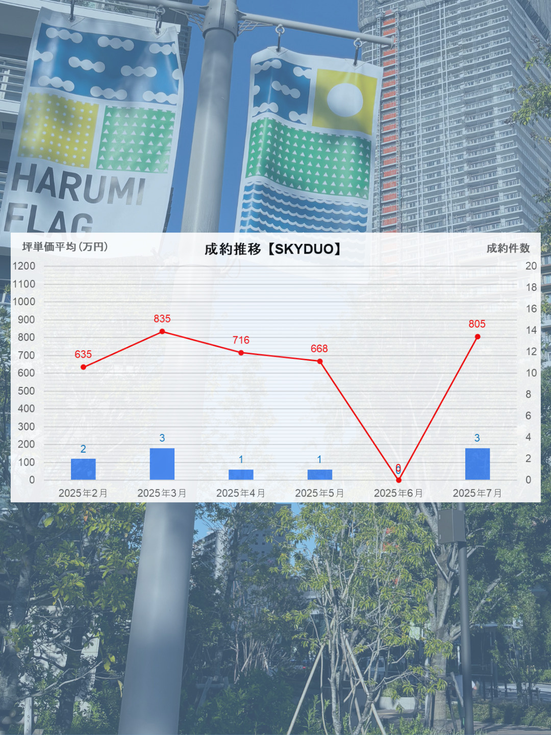 先月のSKY DUOですが、成約件数は3件、成約平均坪単価は805万円でした。レインボーブリッジ側の南側住戸、都心側を望む西側、勝どきのタワーマンション群を望む北側住戸と各方面の3LDKの住戸が成約し、成約価格は17,250万円~18,800万円(坪単価777万円~825万円 / 分譲時比率145%~226%)でした。