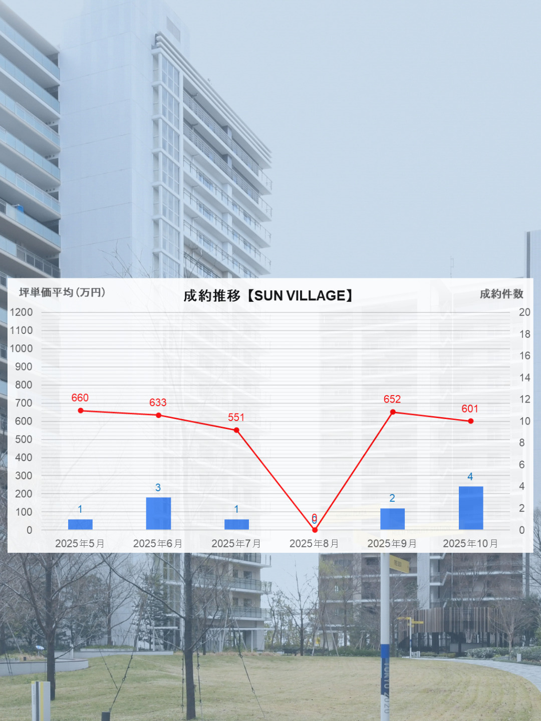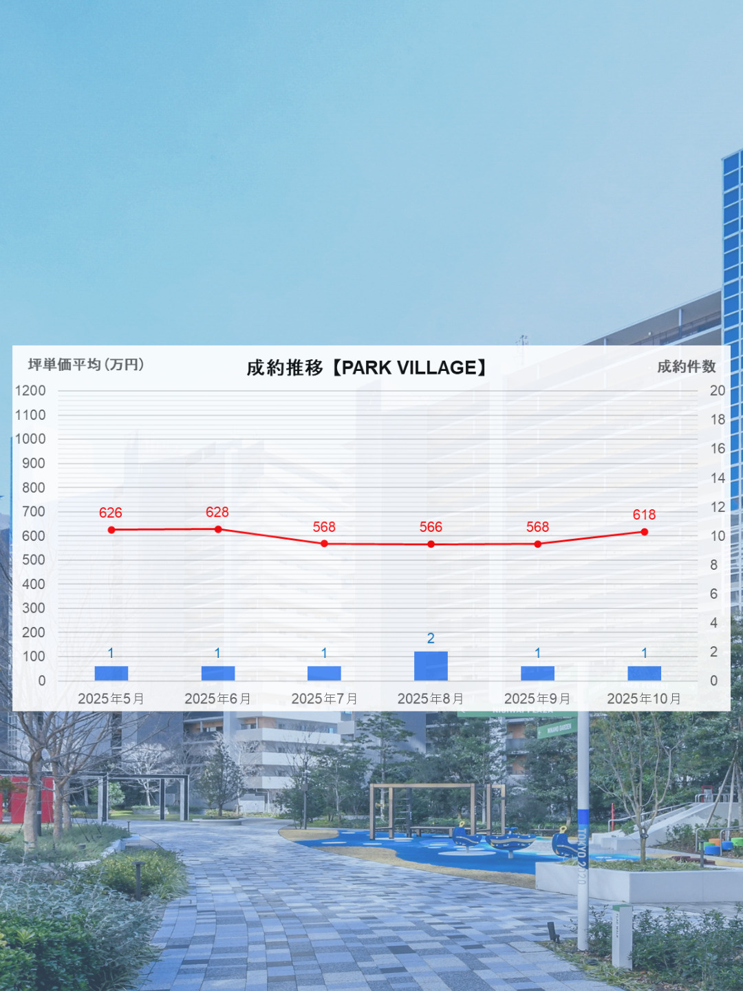 SKY DUO(タワー棟)の竣工・引き渡しと共にHARUMI FLAGという一体の街づくりが完了を迎えたことで、板状(低層)棟も安定して成約件数、価格が推移しております。