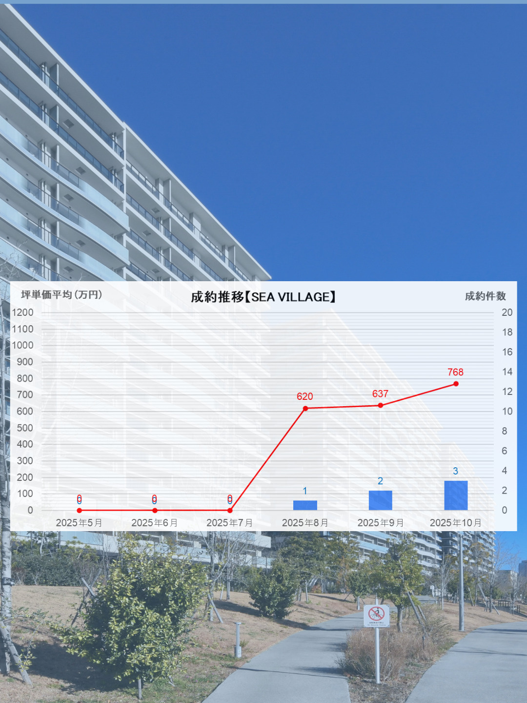 各棟別の成約状況ですが、Sea Villageが3件、Sun Villageがそれぞれ4件、Park Villageが1件の成約件数となります。単価が高いSea Villageの成約が多かったことで、全体の成約単価を押し上げております。