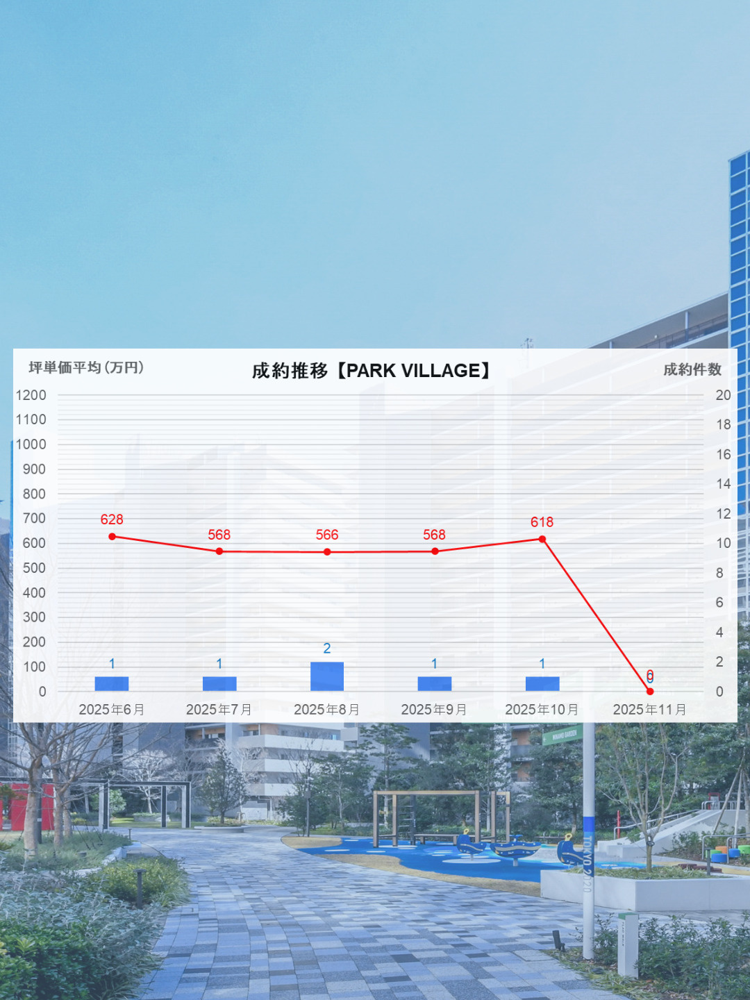 HARUMI FLAGの板状(低層)棟全体では先月の成約件数は10月から大きく落ち込み2件、成約平均坪単価も微減の627万円でした。