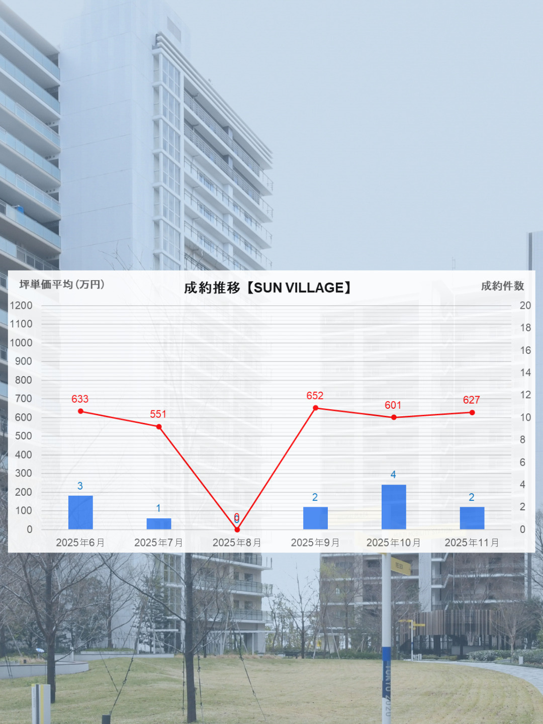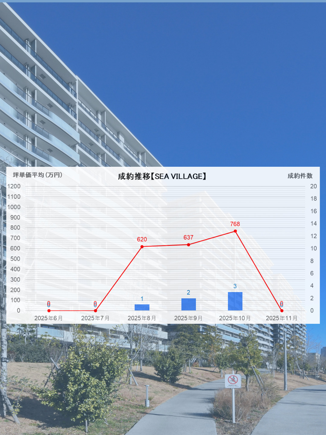 9月・10月と板状(低層)棟の成約件数が比較的多かったことに加え、タワー棟のSKY DUOも多くの住戸が販売に出ていることもあり、板状(低層)棟の成約件数は調整となりました。また、単価の高いSea Villageの成約がなかったことが影響し、成約坪単価も減少しております。