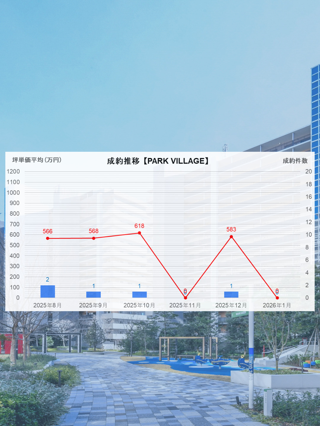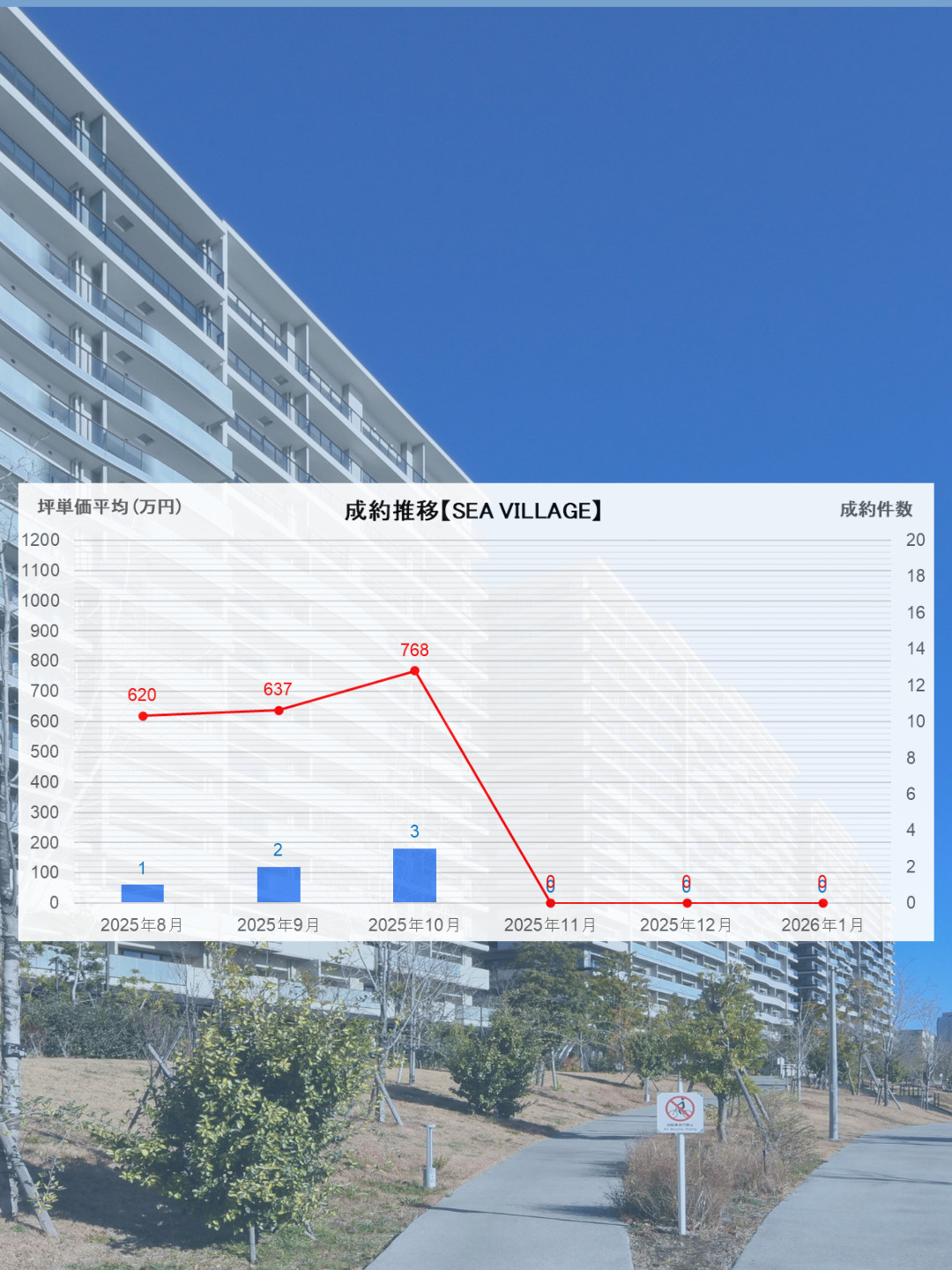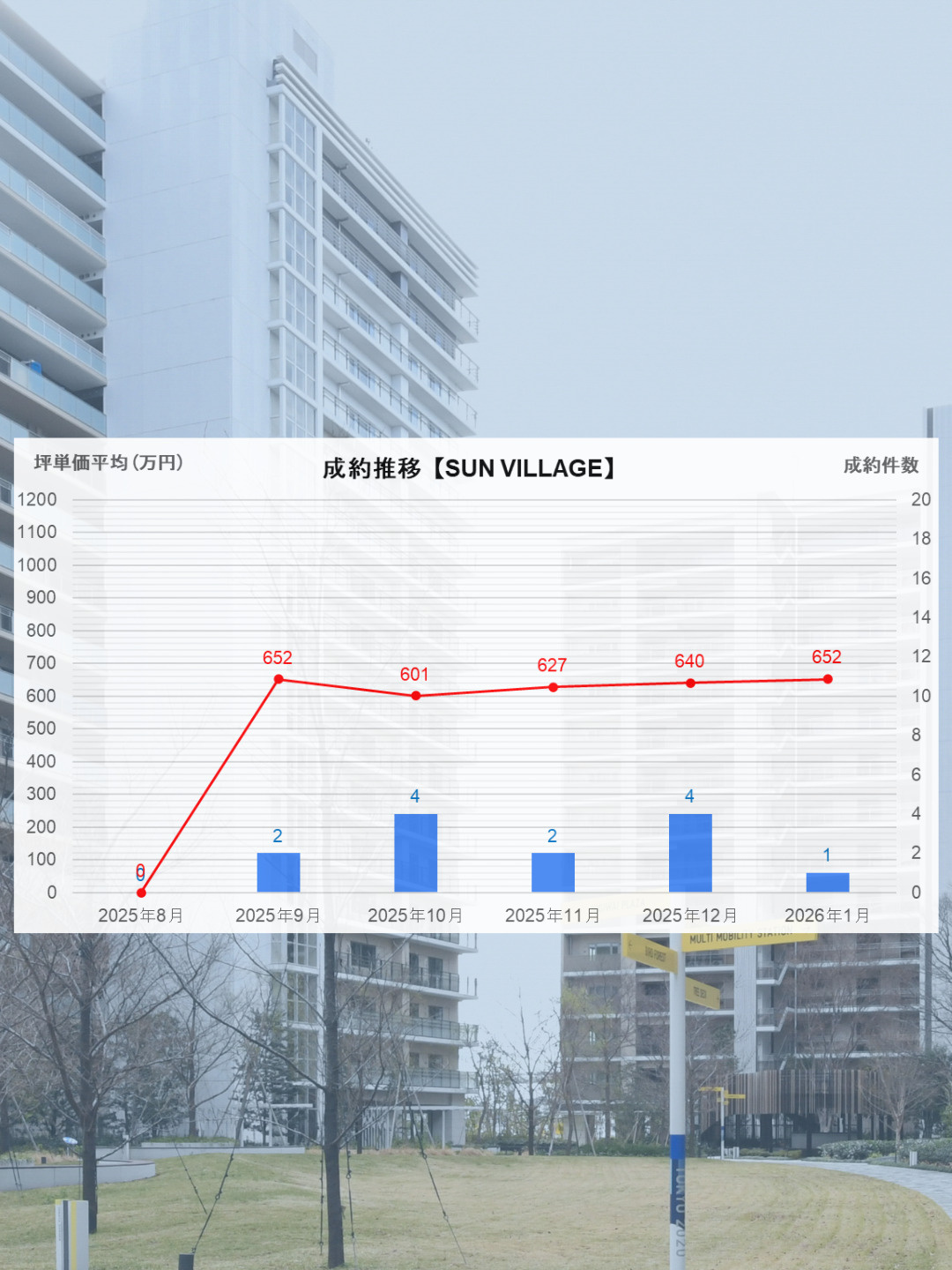 一方で、成約坪単価については10月の666万円と並ぶ高水準となっており、価格面では引き続き底堅さが確認できる結果となりました。件数は伸び悩んだものの、条件の良い住戸については一定の評価を得られている状況といえます。