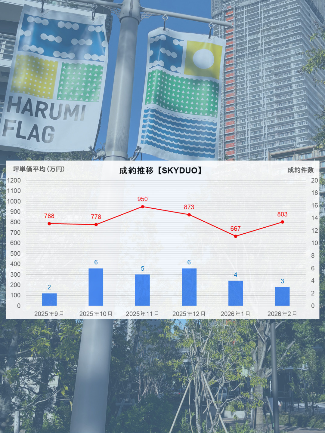 先月のHARUMI FLAG SKY DUOの成約件数は3件となり、前月からは微減となりました。一方で、成約平均坪単価は803万円と前月の667万円から上昇しており、件数は限定的ながら価格面では上昇が見られる結果となっています。特に、Park Village(Tower6)20階・95㎡住戸が坪単価1,072万円で成約するなど、条件の良い住戸では高価格帯での取引が確認されました。こうした事例からも、SKY DUOに対する需要の底堅さがうかがえます。